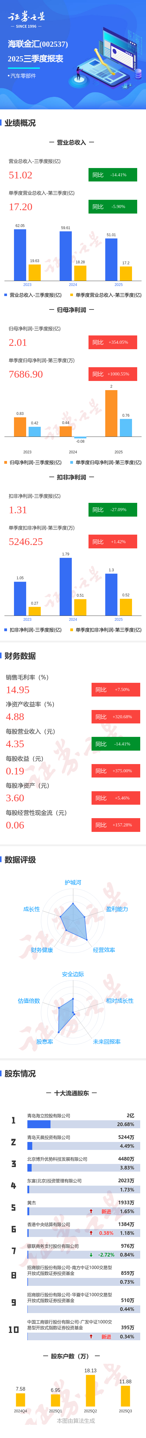 证券之星消息,海联金汇2025年三季报显示,公司主营收入51.02亿元,同比下降14.42%;归母净利润2.01亿元,同比上升354.05%;扣非净利润1.31亿元,同比下降27.1%;其中2025年第三季度,公司单季度主营收入17.2亿元,同比下降5.9%;单季度归母净利润7686.9万元,同比上升1000.56%;单季度扣非净利润5246.25万元,同比上升1.43%;负债率53.19%,投资收益3752.26万元,财务费用2743.61万元,毛利率14.95%。