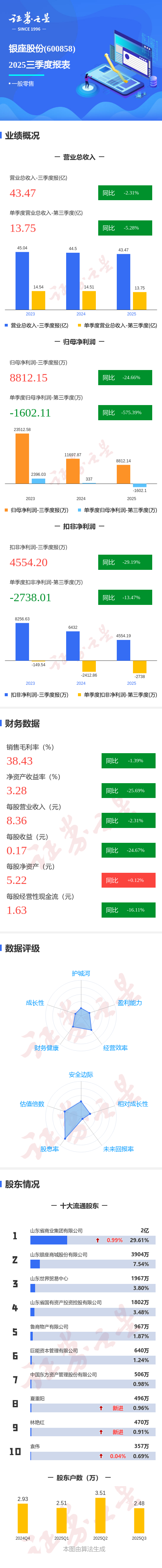证券之星消息,银座股份2025年三季报显示,公司主营收入43.47亿元,同比下降2.31%;归母净利润8812.15万元,同比下降24.67%;扣非净利润4554.2万元,同比下降29.19%;其中2025年第三季度,公司单季度主营收入13.75亿元,同比下降5.29%;单季度归母净利润-1602.11万元,同比下降575.39%;单季度扣非净利润-2738.01万元,同比下降13.48%;负债率76.24%,财务费用1.97亿元,毛利率38.43%。