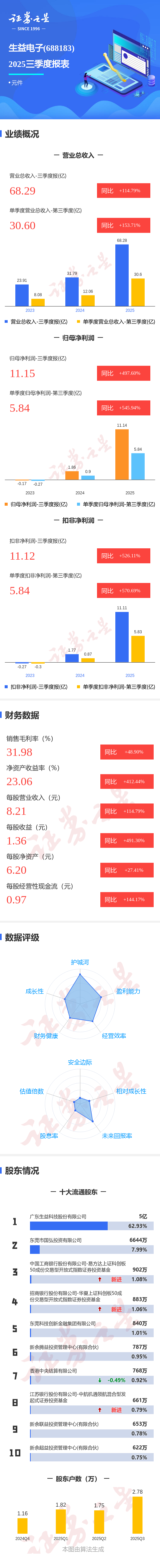 证券之星消息,生益电子2025年三季报显示,公司主营收入68.29亿元,同比上升114.79%;归母净利润11.15亿元,同比上升497.61%;扣非净利润11.12亿元,同比上升526.11%;其中2025年第三季度,公司单季度主营收入30.6亿元,同比上升153.71%;单季度归母净利润5.84亿元,同比上升545.95%;单季度扣非净利润5.84亿元,同比上升570.7%;负债率54.02%,投资收益-5.14万元,财务费用3435.39万元,毛利率31.98%。