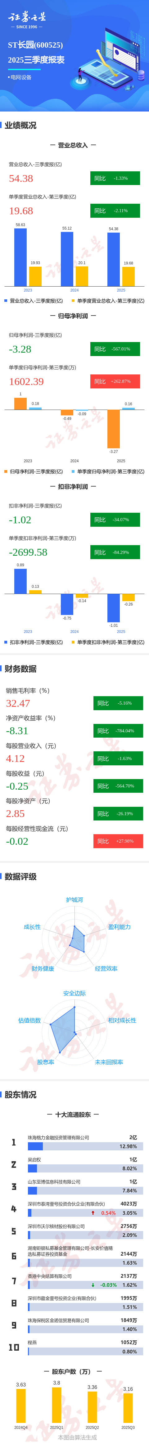 证券之星消息,ST长园2025年三季报显示,公司主营收入54.38亿元,同比下降1.34%;归母净利润-3.28亿元,同比下降567.01%;扣非净利润-1.02亿元,同比下降34.08%;其中2025年第三季度,公司单季度主营收入19.68亿元,同比下降2.11%;单季度归母净利润1602.39万元,同比上升262.88%;单季度扣非净利润-2699.58万元,同比下降84.29%;负债率71.91%,投资收益-2.53亿元,财务费用1.62亿元,毛利率32.47%。