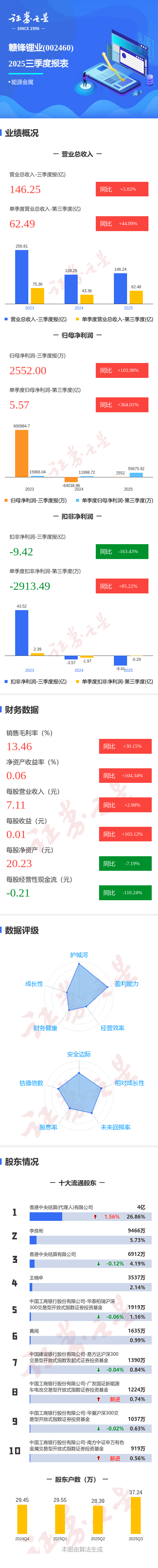 证券之星消息,赣锋锂业2025年三季报显示,公司主营收入146.25亿元,同比上升5.02%;归母净利润2552.0万元,同比上升103.99%;扣非净利润-9.42亿元,同比下降163.43%;其中2025年第三季度,公司单季度主营收入62.49亿元,同比上升44.1%;单季度归母净利润5.57亿元,同比上升364.02%;单季度扣非净利润-2913.49万元,同比上升85.22%;负债率57.59%,投资收益3.9亿元,财务费用10.28亿元,毛利率13.46%。