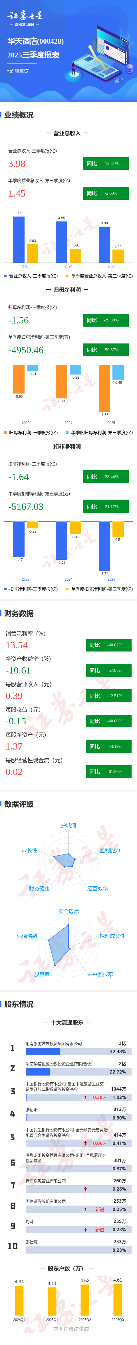 证券之星消息,华天酒店2025年三季报显示,公司主营收入3.98亿元,同比下降12.52%;归母净利润-1.56亿元,同比下降39.99%;扣非净利润-1.64亿元,同比下降28.45%;其中2025年第三季度,公司单季度主营收入1.45亿元,同比下降2.6%;单季度归母净利润-4950.46万元,同比下降50.87%;单季度扣非净利润-5167.03万元,同比下降21.17%;负债率81.18%,投资收益-1033.78万元,财务费用7763.23万元,毛利率13.54%。