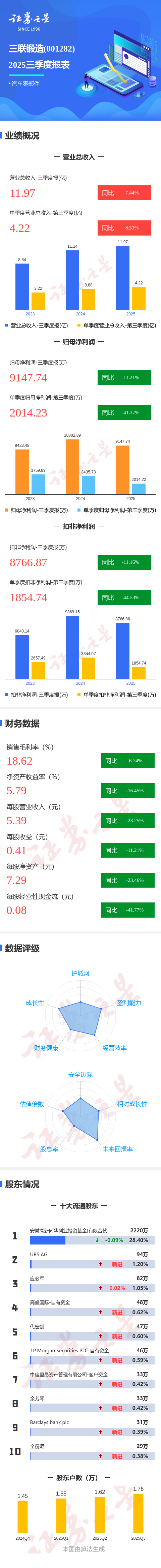 证券之星消息,三联锻造2025年三季报显示,公司主营收入11.97亿元,同比上升7.45%;归母净利润9147.74万元,同比下降11.21%;扣非净利润8766.87万元,同比下降11.17%;其中2025年第三季度,公司单季度主营收入4.22亿元,同比上升8.53%;单季度归母净利润2014.23万元,同比下降41.37%;单季度扣非净利润1854.74万元,同比下降44.54%;负债率38.23%,投资收益164.1万元,财务费用-402.22万元,毛利率18.62%。