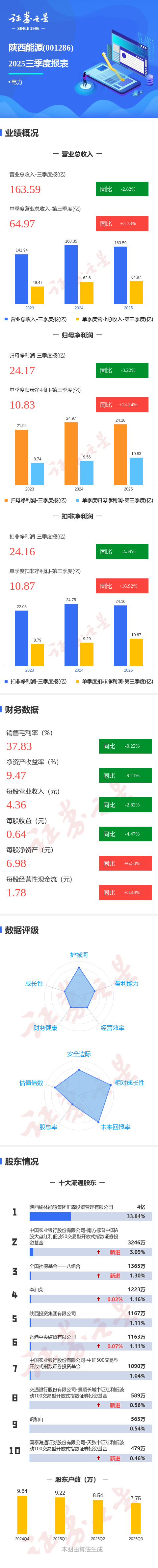 证券之星消息,陕西能源2025年三季报显示,公司主营收入163.59亿元,同比下降2.83%;归母净利润24.17亿元,同比下降3.23%;扣非净利润24.16亿元,同比下降2.39%;其中2025年第三季度,公司单季度主营收入64.97亿元,同比上升3.78%;单季度归母净利润10.83亿元,同比上升13.24%;单季度扣非净利润10.87亿元,同比上升16.92%;负债率52.79%,投资收益2.51亿元,财务费用4.66亿元,毛利率37.83%。