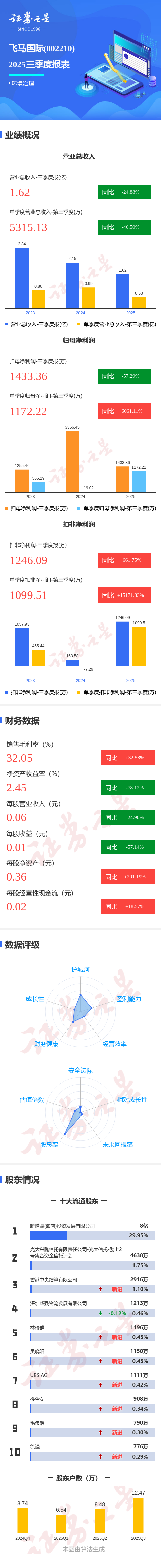 证券之星消息,飞马国际2025年三季报显示,公司主营收入1.62亿元,同比下降24.89%;归母净利润1433.36万元,同比下降57.3%;扣非净利润1246.09万元,同比上升661.75%;其中2025年第三季度,公司单季度主营收入5315.13万元,同比下降46.51%;单季度归母净利润1172.22万元,同比上升6061.12%;单季度扣非净利润1099.51万元,同比上升15171.83%;负债率32.23%,投资收益15.95万元,财务费用1480.85万元,毛利率32.05%。