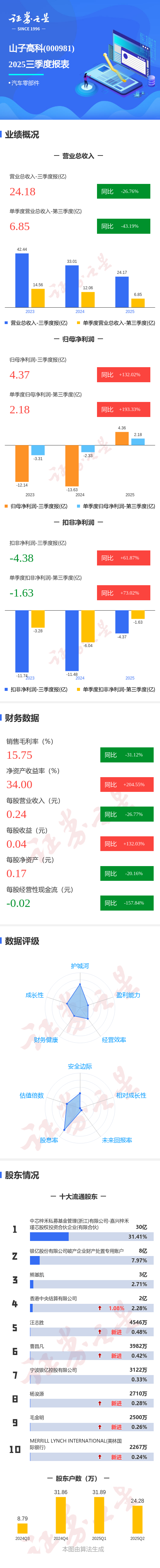 证券之星消息,山子高科2025年三季报显示,公司主营收入24.18亿元,同比下降26.76%;归母净利润4.37亿元,同比上升132.03%;扣非净利润-4.38亿元,同比上升61.88%;其中2025年第三季度,公司单季度主营收入6.85亿元,同比下降43.19%;单季度归母净利润2.18亿元,同比上升193.33%;单季度扣非净利润-1.63亿元,同比上升73.02%;负债率79.94%,投资收益6.57亿元,财务费用3494.44万元,毛利率15.75%。