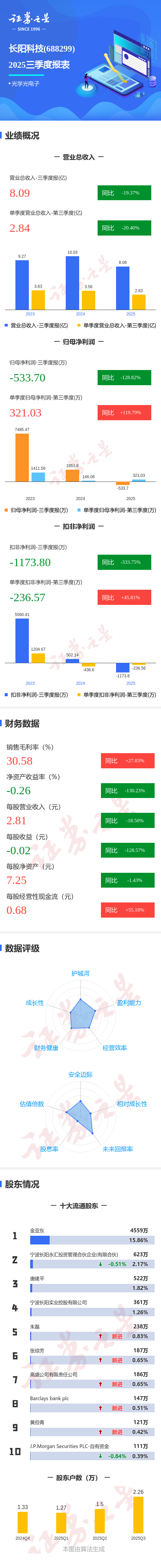 证券之星消息,长阳科技2025年三季报显示,公司主营收入8.09亿元,同比下降19.38%;归母净利润-533.7万元,同比下降128.82%;扣非净利润-1173.8万元,同比下降333.76%;其中2025年第三季度,公司单季度主营收入2.84亿元,同比下降20.4%;单季度归母净利润321.03万元,同比上升119.79%;单季度扣非净利润-236.57万元,同比上升45.82%;负债率38.15%,投资收益-204.96万元,财务费用977.52万元,毛利率30.58%。