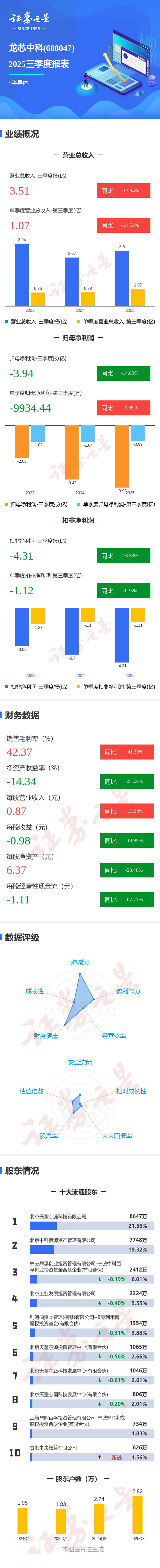 证券之星消息,龙芯中科2025年三季报显示,公司主营收入3.51亿元,同比上升13.94%;归母净利润-3.94亿元,同比下降14.89%;扣非净利润-4.31亿元,同比下降16.4%;其中2025年第三季度,公司单季度主营收入1.07亿元,同比上升21.53%;单季度归母净利润-9934.44万元,同比上升5.05%;单季度扣非净利润-1.12亿元,同比下降1.35%;负债率18.43%,投资收益811.79万元,财务费用-137.35万元,毛利率42.37%。
