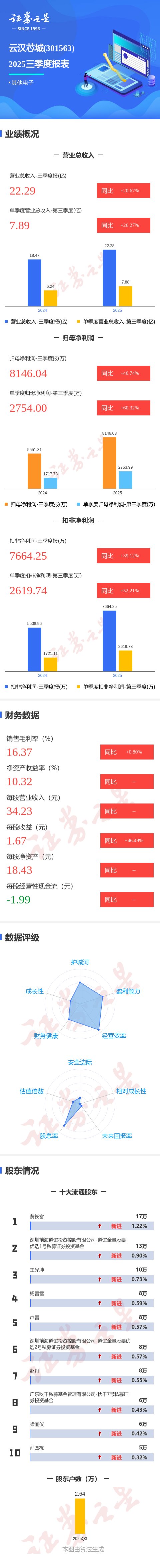 证券之星消息,云汉芯城2025年三季报显示,公司主营收入22.29亿元,同比上升20.68%;归母净利润8146.04万元,同比上升46.74%;扣非净利润7664.25万元,同比上升39.12%;其中2025年第三季度,公司单季度主营收入7.89亿元,同比上升26.27%;单季度归母净利润2754.0万元,同比上升60.33%;单季度扣非净利润2619.74万元,同比上升52.21%;负债率32.49%,投资收益-70.82万元,财务费用889.06万元,毛利率16.37%。