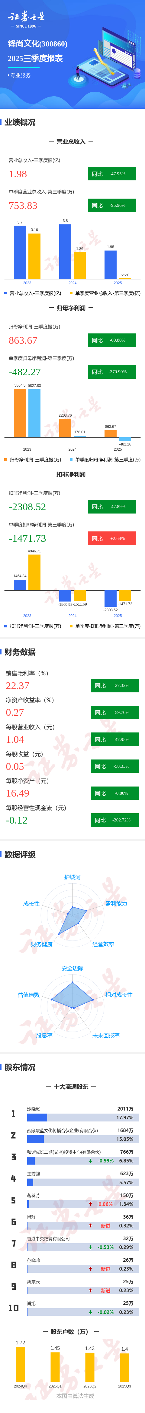 证券之星消息,锋尚文化2025年三季报显示,公司主营收入1.98亿元,同比下降47.95%;归母净利润863.67万元,同比下降60.81%;扣非净利润-2308.52万元,同比下降47.89%;其中2025年第三季度,公司单季度主营收入753.83万元,同比下降95.96%;单季度归母净利润-482.27万元,同比下降370.91%;单季度扣非净利润-1471.73万元,同比上升2.64%;负债率8.67%,投资收益3278.52万元,财务费用-378.7万元,毛利率22.37%。