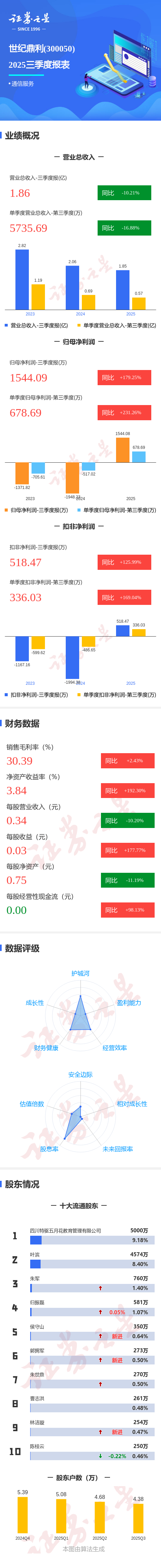 证券之星消息,世纪鼎利2025年三季报显示,公司主营收入1.86亿元,同比下降10.22%;归母净利润1544.09万元,同比上升179.26%;扣非净利润518.47万元,同比上升126.0%;其中2025年第三季度,公司单季度主营收入5735.69万元,同比下降16.88%;单季度归母净利润678.69万元,同比上升231.27%;单季度扣非净利润336.03万元,同比上升169.05%;负债率32.04%,投资收益232.83万元,财务费用-11.73万元,毛利率30.39%。