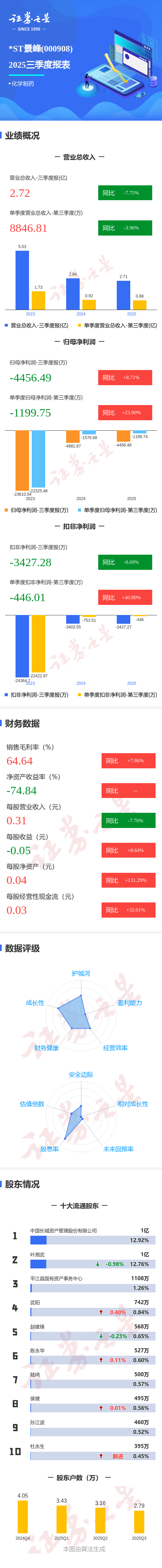 证券之星消息,*ST景峰2025年三季报显示,公司主营收入2.72亿元,同比下降7.75%;归母净利润-4456.49万元,同比上升8.71%;扣非净利润-3427.28万元,同比下降0.7%;其中2025年第三季度,公司单季度主营收入8846.81万元,同比下降3.97%;单季度归母净利润-1199.75万元,同比上升23.91%;单季度扣非净利润-446.01万元,同比上升40.81%;负债率104.3%,投资收益139.58万元,财务费用1763.83万元,毛利率64.64%。
