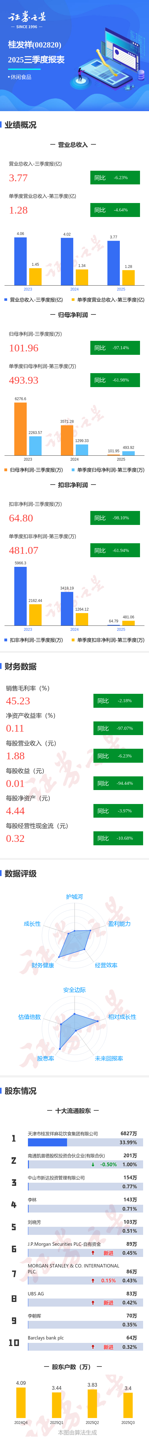 证券之星消息,桂发祥2025年三季报显示,公司主营收入3.77亿元,同比下降6.23%;归母净利润101.96万元,同比下降97.14%;扣非净利润64.8万元,同比下降98.1%;其中2025年第三季度,公司单季度主营收入1.28亿元,同比下降4.65%;单季度归母净利润493.93万元,同比下降61.99%;单季度扣非净利润481.07万元,同比下降61.94%;负债率9.83%,投资收益216.22万元,财务费用22.93万元,毛利率45.23%。