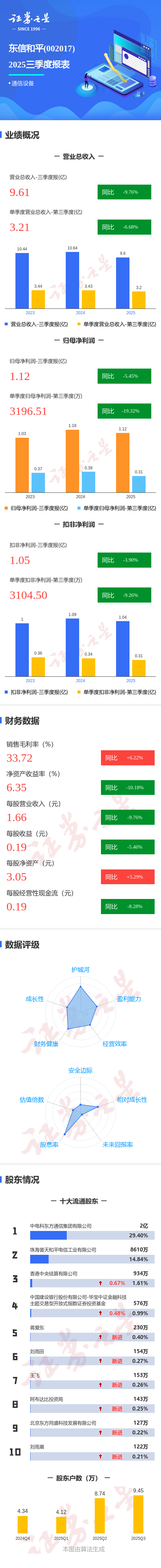 证券之星消息,东信和平2025年三季报显示,公司主营收入9.61亿元,同比下降9.77%;归母净利润1.12亿元,同比下降5.45%;扣非净利润1.05亿元,同比下降3.9%;其中2025年第三季度,公司单季度主营收入3.21亿元,同比下降6.68%;单季度归母净利润3196.51万元,同比下降19.32%;单季度扣非净利润3104.5万元,同比下降9.26%;负债率40.03%,投资收益-47.15万元,财务费用-2859.93万元,毛利率33.72%。