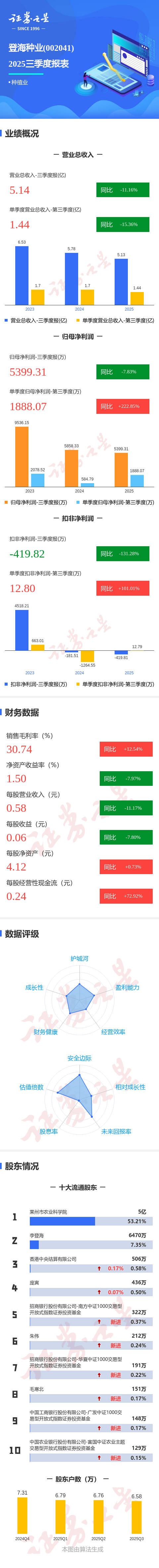 证券之星消息,登海种业2025年三季报显示,公司主营收入5.14亿元,同比下降11.17%;归母净利润5399.31万元,同比下降7.84%;扣非净利润-419.82万元,同比下降131.29%;其中2025年第三季度,公司单季度主营收入1.44亿元,同比下降15.36%;单季度归母净利润1888.07万元,同比上升222.86%;单季度扣非净利润12.8万元,同比上升101.01%;负债率22.0%,投资收益1899.99万元,财务费用-2585.39万元,毛利率30.74%。