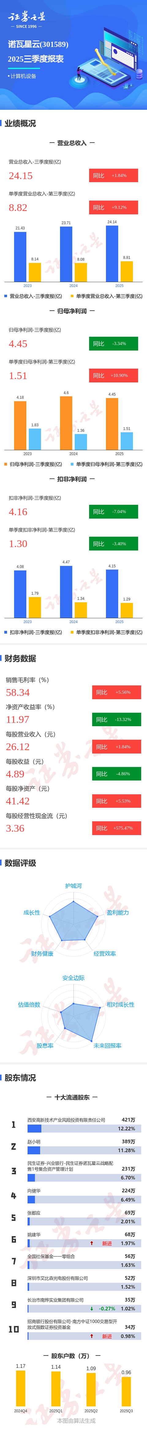 证券之星消息,诺瓦星云2025年三季报显示,公司主营收入24.15亿元,同比上升1.84%;归母净利润4.45亿元,同比下降3.34%;扣非净利润4.16亿元,同比下降7.05%;其中2025年第三季度,公司单季度主营收入8.82亿元,同比上升9.13%;单季度归母净利润1.51亿元,同比上升10.9%;单季度扣非净利润1.3亿元,同比下降3.41%;负债率32.34%,投资收益552.58万元,财务费用330.05万元,毛利率58.34%。