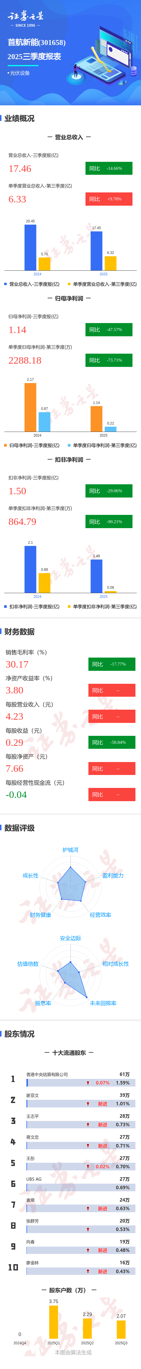 证券之星消息,首航新能2025年三季报显示,公司主营收入17.46亿元,同比下降14.66%;归母净利润1.14亿元,同比下降47.57%;扣非净利润1.5亿元,同比下降29.07%;其中2025年第三季度,公司单季度主营收入6.33亿元,同比上升9.79%;单季度归母净利润2288.18万元,同比下降73.72%;单季度扣非净利润864.79万元,同比下降90.22%;负债率35.59%,投资收益-2321.67万元,财务费用-1.54亿元,毛利率30.17%。