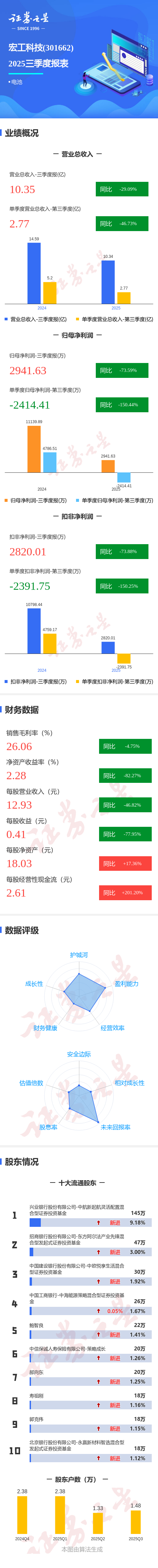 证券之星消息,宏工科技2025年三季报显示,公司主营收入10.35亿元,同比下降29.09%;归母净利润2941.63万元,同比下降73.59%;扣非净利润2820.01万元,同比下降73.89%;其中2025年第三季度,公司单季度主营收入2.77亿元,同比下降46.73%;单季度归母净利润-2414.41万元,同比下降150.44%;单季度扣非净利润-2391.75万元,同比下降150.26%;负债率68.66%,财务费用827.59万元,毛利率26.06%。