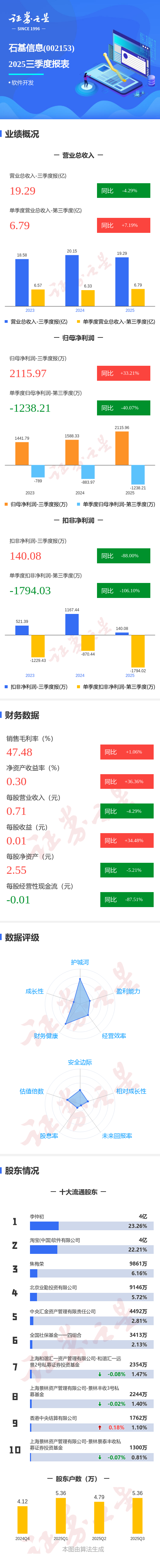 证券之星消息,石基信息2025年三季报显示,公司主营收入19.29亿元,同比下降4.29%;归母净利润2115.97万元,同比上升33.22%;扣非净利润140.08万元,同比下降88.0%;其中2025年第三季度,公司单季度主营收入6.79亿元,同比上升7.19%;单季度归母净利润-1238.21万元,同比下降40.07%;单季度扣非净利润-1794.03万元,同比下降106.1%;负债率16.47%,投资收益1171.72万元,财务费用-1.29亿元,毛利率47.48%。