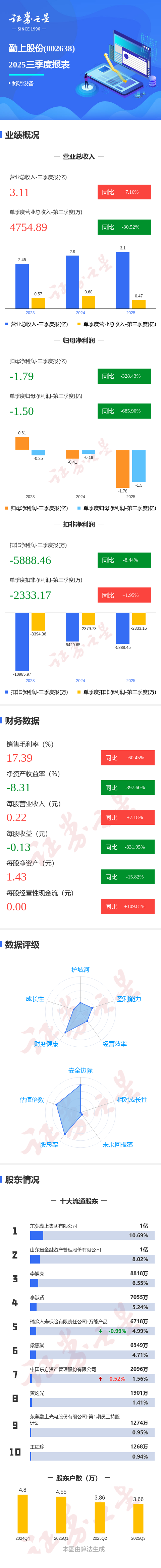 证券之星消息,勤上股份2025年三季报显示,公司主营收入3.11亿元,同比上升7.16%;归母净利润-1.79亿元,同比下降328.44%;扣非净利润-5888.46万元,同比下降8.45%;其中2025年第三季度,公司单季度主营收入4754.89万元,同比下降30.53%;单季度归母净利润-1.5亿元,同比下降685.91%;单季度扣非净利润-2333.17万元,同比上升1.96%;负债率11.47%,投资收益275.33万元,财务费用-67.46万元,毛利率17.39%。
