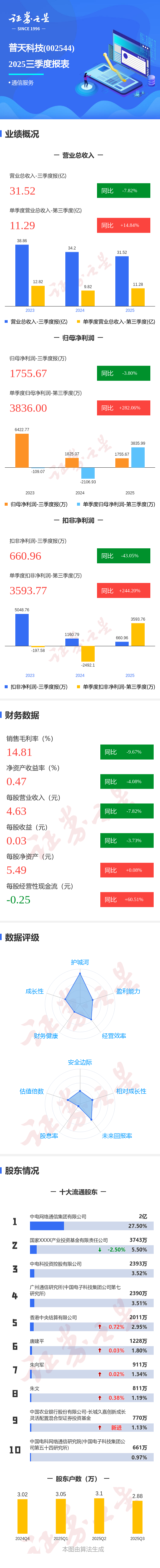证券之星消息,普天科技2025年三季报显示,公司主营收入31.52亿元,同比下降7.82%;归母净利润1755.67万元,同比下降3.8%;扣非净利润660.96万元,同比下降43.06%;其中2025年第三季度,公司单季度主营收入11.29亿元,同比上升14.84%;单季度归母净利润3836.0万元,同比上升282.07%;单季度扣非净利润3593.77万元,同比上升244.21%;负债率59.14%,财务费用720.14万元,毛利率14.81%。