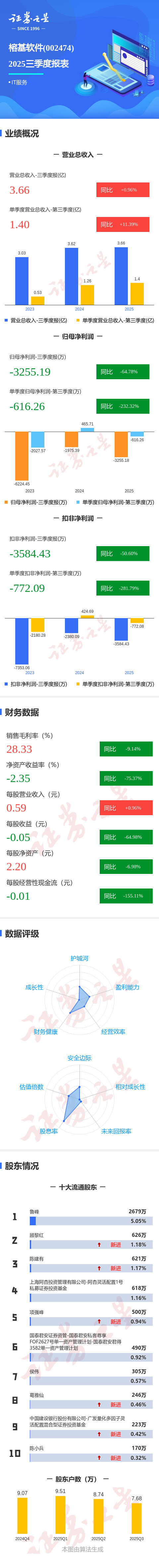 证券之星消息,榕基软件2025年三季报显示,公司主营收入3.66亿元,同比上升0.96%;归母净利润-3255.19万元,同比下降64.79%;扣非净利润-3584.43万元,同比下降50.6%;其中2025年第三季度,公司单季度主营收入1.4亿元,同比上升11.39%;单季度归母净利润-616.26万元,同比下降232.32%;单季度扣非净利润-772.09万元,同比下降281.8%;负债率45.96%,投资收益1052.92万元,财务费用1190.06万元,毛利率28.33%。