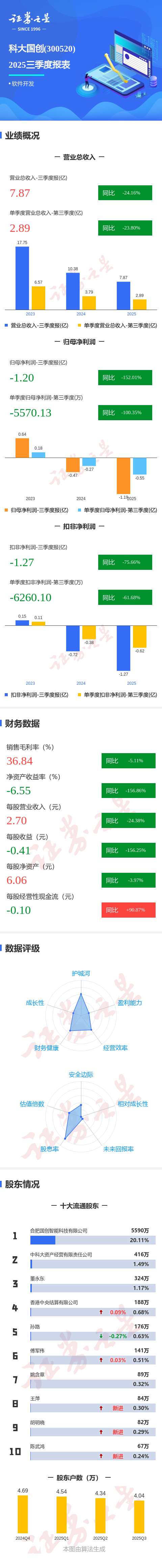 证券之星消息,科大国创2025年三季报显示,公司主营收入7.87亿元,同比下降24.16%;归母净利润-1.2亿元,同比下降152.01%;扣非净利润-1.27亿元,同比下降75.67%;其中2025年第三季度,公司单季度主营收入2.89亿元,同比下降23.81%;单季度归母净利润-5570.13万元,同比下降100.35%;单季度扣非净利润-6260.1万元,同比下降61.69%;负债率59.37%,投资收益259.35万元,财务费用1175.57万元,毛利率36.84%。