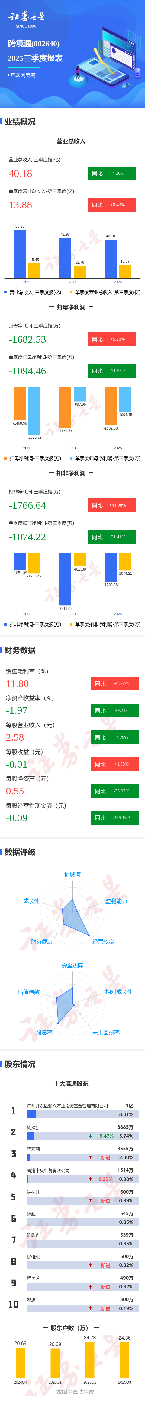 证券之星消息,跨境通2025年三季报显示,公司主营收入40.18亿元,同比下降4.3%;归母净利润-1682.53万元,同比上升5.28%;扣非净利润-1766.64万元,同比上升44.98%;其中2025年第三季度,公司单季度主营收入13.88亿元,同比上升8.43%;单季度归母净利润-1094.46万元,同比下降71.56%;单季度扣非净利润-1074.22万元,同比下降31.42%;负债率75.97%,投资收益177.58万元,财务费用1.16亿元,毛利率11.8%。