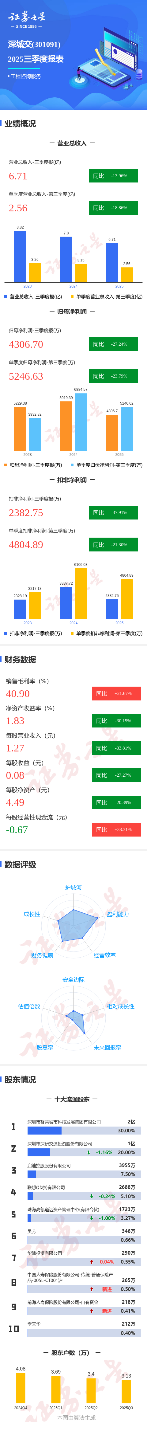 证券之星消息,深城交2025年三季报显示,公司主营收入6.71亿元,同比下降13.96%;归母净利润4306.7万元,同比下降27.24%;扣非净利润2382.75万元,同比下降37.91%;其中2025年第三季度,公司单季度主营收入2.56亿元,同比下降18.87%;单季度归母净利润5246.63万元,同比下降23.79%;单季度扣非净利润4804.89万元,同比下降21.31%;负债率27.81%,投资收益351.99万元,财务费用441.96万元,毛利率40.9%。