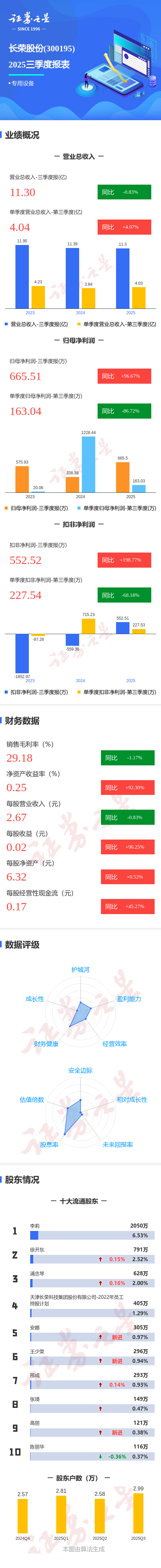 证券之星消息,长荣股份2025年三季报显示,公司主营收入11.3亿元,同比下降0.84%;归母净利润665.51万元,同比上升96.67%;扣非净利润552.52万元,同比上升198.78%;其中2025年第三季度,公司单季度主营收入4.04亿元,同比上升4.97%;单季度归母净利润163.04万元,同比下降86.73%;单季度扣非净利润227.54万元,同比下降68.19%;负债率54.91%,投资收益-137.0万元,财务费用3247.38万元,毛利率29.18%。