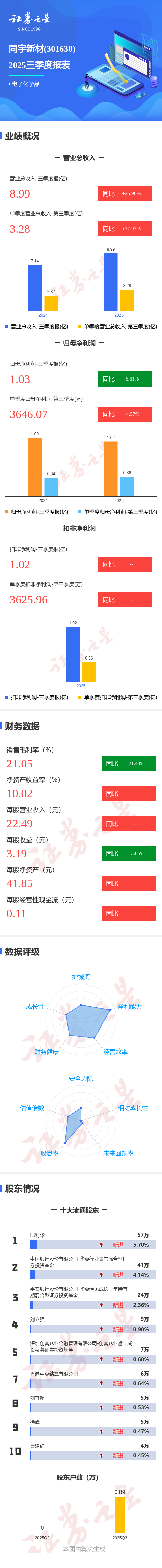 证券之星消息,同宇新材2025年三季报显示,公司主营收入8.99亿元,同比上升25.96%;归母净利润1.03亿元,同比下降6.62%;扣非净利润1.02亿元,其中2025年第三季度,公司单季度主营收入3.28亿元,同比上升37.94%;单季度归母净利润3646.07万元,同比上升4.58%;单季度扣非净利润3625.96万元,负债率31.46%,投资收益-145.47万元,财务费用352.84万元,毛利率21.05%。