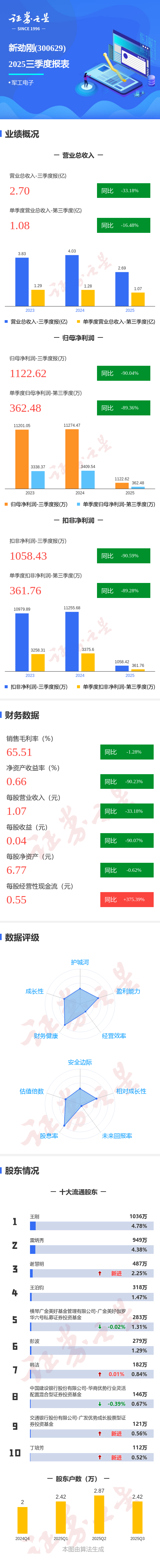 证券之星消息,新劲刚2025年三季报显示,公司主营收入2.7亿元,同比下降33.18%;归母净利润1122.62万元,同比下降90.04%;扣非净利润1058.43万元,同比下降90.6%;其中2025年第三季度,公司单季度主营收入1.08亿元,同比下降16.49%;单季度归母净利润362.48万元,同比下降89.37%;单季度扣非净利润361.76万元,同比下降89.28%;负债率16.31%,投资收益5.33万元,财务费用482.06万元,毛利率65.51%。