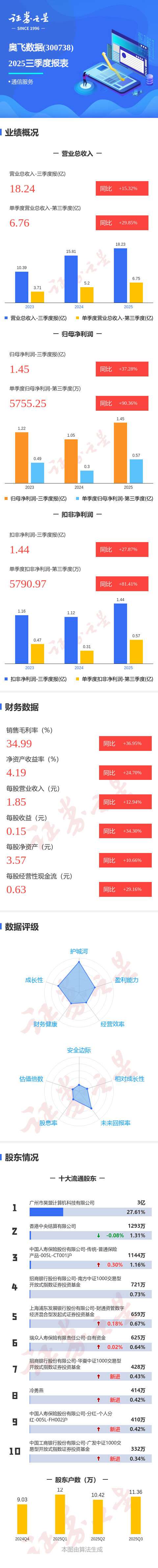 证券之星消息,奥飞数据2025年三季报显示,公司主营收入18.24亿元,同比上升15.33%;归母净利润1.45亿元,同比上升37.29%;扣非净利润1.44亿元,同比上升27.88%;其中2025年第三季度,公司单季度主营收入6.76亿元,同比上升29.86%;单季度归母净利润5755.25万元,同比上升90.36%;单季度扣非净利润5790.97万元,同比上升81.42%;负债率75.83%,投资收益-270.72万元,财务费用2.18亿元,毛利率34.99%。