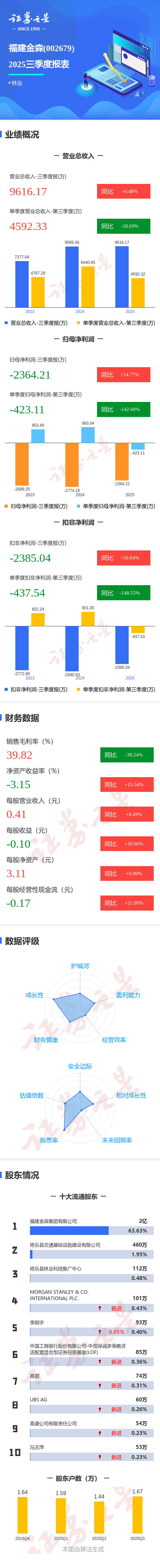 证券之星消息,福建金森2025年三季报显示,公司主营收入9616.17万元,同比上升0.49%;归母净利润-2364.21万元,同比上升14.78%;扣非净利润-2385.04万元,同比上升16.05%;其中2025年第三季度,公司单季度主营收入4592.33万元,同比下降28.7%;单季度归母净利润-423.11万元,同比下降142.61%;单季度扣非净利润-437.54万元,同比下降148.56%;负债率62.17%,投资收益62.11万元,财务费用3070.25万元,毛利率39.82%。