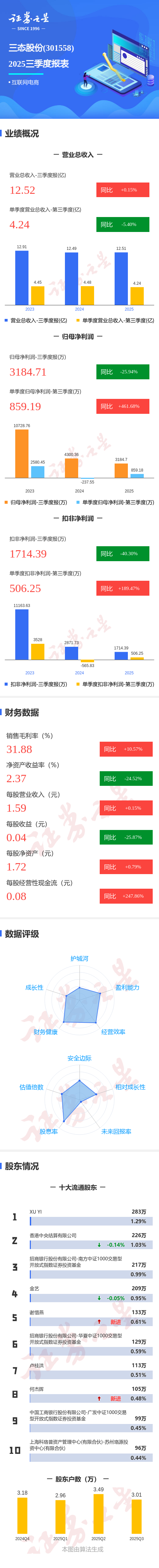 证券之星消息,三态股份2025年三季报显示,公司主营收入12.52亿元,同比上升0.15%;归母净利润3184.71万元,同比下降25.94%;扣非净利润1714.39万元,同比下降40.3%;其中2025年第三季度,公司单季度主营收入4.24亿元,同比下降5.41%;单季度归母净利润859.19万元,同比上升461.68%;单季度扣非净利润506.25万元,同比上升189.47%;负债率10.03%,投资收益799.07万元,财务费用680.81万元,毛利率31.88%。