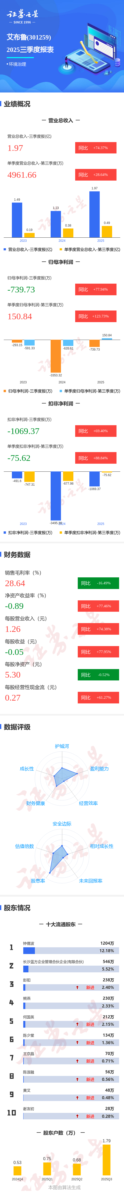 证券之星消息,艾布鲁2025年三季报显示,公司主营收入1.97亿元,同比上升74.38%;归母净利润-739.73万元,同比上升77.94%;扣非净利润-1069.37万元,同比上升69.41%;其中2025年第三季度,公司单季度主营收入4961.66万元,同比上升28.65%;单季度归母净利润150.84万元,同比上升123.73%;单季度扣非净利润-75.62万元,同比上升88.85%;负债率42.64%,投资收益218.75万元,财务费用410.78万元,毛利率28.64%。