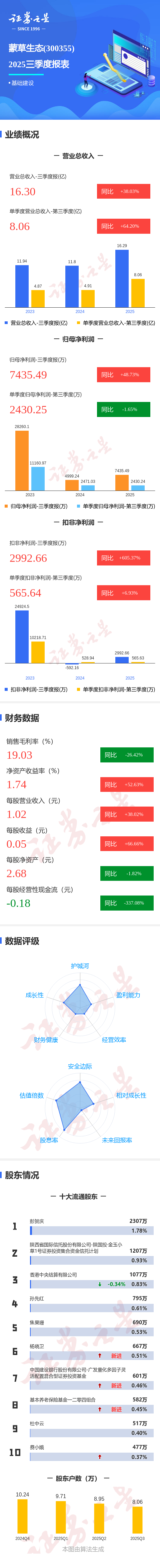证券之星消息,蒙草生态2025年三季报显示,公司主营收入16.3亿元,同比上升38.04%;归母净利润7435.49万元,同比上升48.73%;扣非净利润2992.66万元,同比上升605.38%;其中2025年第三季度,公司单季度主营收入8.06亿元,同比上升64.21%;单季度归母净利润2430.25万元,同比下降1.65%;单季度扣非净利润565.64万元,同比上升6.94%;负债率67.24%,投资收益1515.05万元,财务费用5281.58万元,毛利率19.03%。