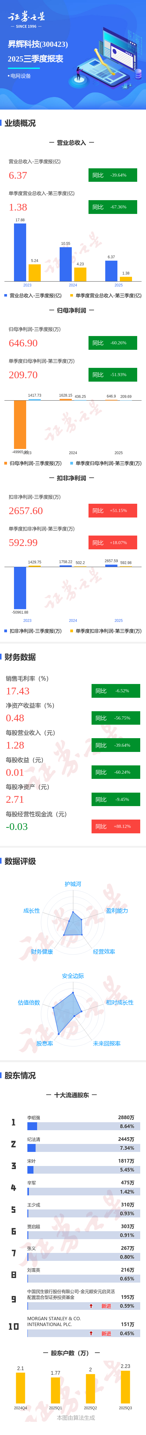 证券之星消息,昇辉科技2025年三季报显示,公司主营收入6.37亿元,同比下降39.64%;归母净利润646.9万元,同比下降60.27%;扣非净利润2657.6万元,同比上升51.15%;其中2025年第三季度,公司单季度主营收入1.38亿元,同比下降67.37%;单季度归母净利润209.7万元,同比下降51.93%;单季度扣非净利润592.99万元,同比上升18.08%;负债率50.46%,投资收益167.78万元,财务费用460.82万元,毛利率17.43%。