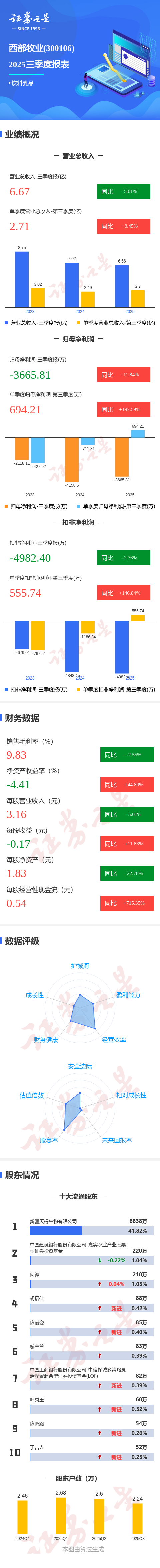 证券之星消息,西部牧业2025年三季报显示,公司主营收入6.67亿元,同比下降5.01%;归母净利润-3665.81万元,同比上升11.85%;扣非净利润-4982.4万元,同比下降2.76%;其中2025年第三季度,公司单季度主营收入2.71亿元,同比上升8.46%;单季度归母净利润694.21万元,同比上升197.6%;单季度扣非净利润555.74万元,同比上升146.84%;负债率50.65%,投资收益317.02万元,财务费用399.0万元,毛利率9.83%。