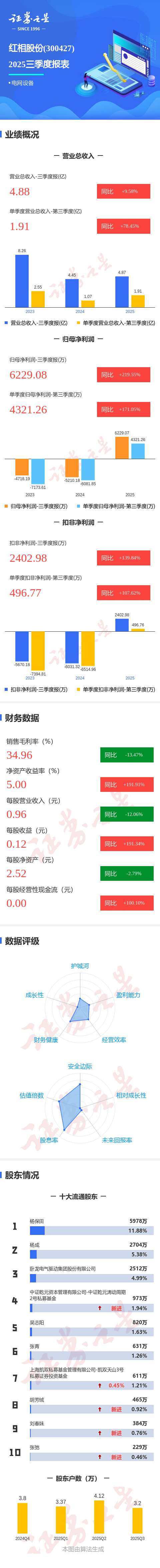 证券之星消息,红相股份2025年三季报显示,公司主营收入4.88亿元,同比上升9.59%;归母净利润6229.08万元,同比上升219.56%;扣非净利润2402.98万元,同比上升139.84%;其中2025年第三季度,公司单季度主营收入1.91亿元,同比上升78.46%;单季度归母净利润4321.26万元,同比上升171.05%;单季度扣非净利润496.77万元,同比上升107.62%;负债率26.61%,投资收益-80.47万元,财务费用-29.46万元,毛利率34.96%。