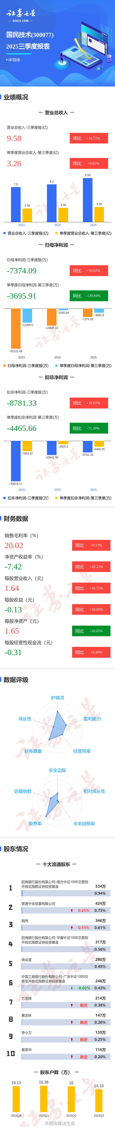 证券之星消息,国民技术2025年三季报显示,公司主营收入9.58亿元,同比上升16.73%;归母净利润-7374.09万元,同比上升50.63%;扣非净利润-8781.33万元,同比上升19.01%;其中2025年第三季度,公司单季度主营收入3.26亿元,同比上升6.62%;单季度归母净利润-3695.91万元,同比下降139.85%;单季度扣非净利润-4465.66万元,同比下降71.39%;负债率72.62%,投资收益-230.83万元,财务费用5875.11万元,毛利率20.02%。