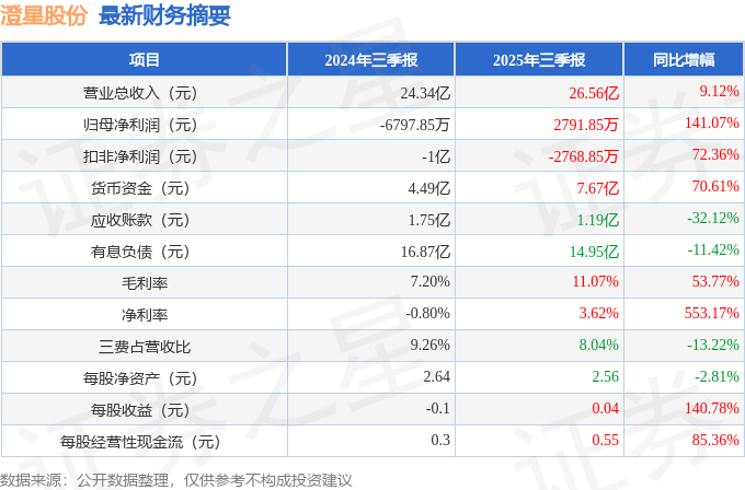 据证券之星公开数据整理,近期澄星股份(600078)发布2025年三季报。截至本报告期末,公司营业总收入26.56亿元,同比上升9.12%,归母净利润2791.85万元,同比上升141.07%。按单季度数据看,第三季度营业总收入8.8亿元,同比上升7.68%,第三季度归母净利润935.73万元,同比上升118.25%。本报告期澄星股份盈利能力上升,毛利率同比增幅53.77%,净利率同比增幅553.17%。