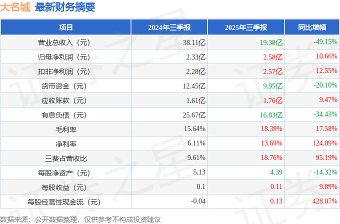 据证券之星公开数据整理,近期大名城(600094)发布2025年三季报。截至本报告期末,公司营业总收入19.38亿元,同比下降49.15%,归母净利润2.58亿元,同比上升10.66%。按单季度数据看,第三季度营业总收入3.49亿元,同比下降86.47%,第三季度归母净利润2.24亿元,同比上升156.86%。本报告期大名城三费占比上升明显,财务费用、销售费用和管理费用总和占总营收同比增幅达95.19%。