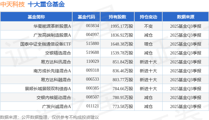 持有中天科技最多的基金为华夏能源革新股票A,目前规模为94.36亿元,最新净值3.208(10月27日),较上一交易日上涨1.2%,近一年上涨30.35%。该基金现任基金经理为杨宇。