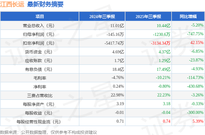 据证券之星公开数据整理,近期江西长运(600561)发布2025年三季报。截至本报告期末,公司营业总收入10.44亿元,同比下降5.2%,归母净利润-1230.6万元,同比下降747.75%。按单季度数据看,第三季度营业总收入3.44亿元,同比下降10.54%,第三季度归母净利润-1802.87万元,同比下降542.97%。本报告期江西长运公司应收账款体量较大,当期应收账款占最新年报归母净利润比达1170.3%。