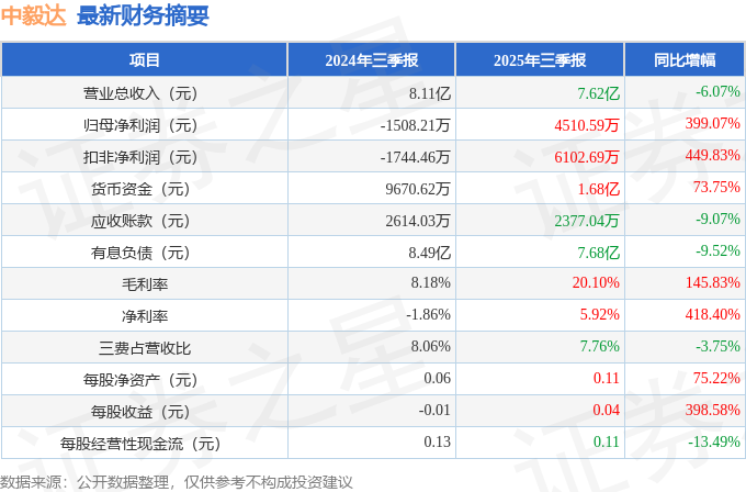 据证券之星公开数据整理,近期中毅达(600610)发布2025年三季报。截至本报告期末,公司营业总收入7.62亿元,同比下降6.07%,归母净利润4510.59万元,同比上升399.07%。按单季度数据看,第三季度营业总收入2.6亿元,同比上升5.84%,第三季度归母净利润557.1万元,同比上升759.72%。本报告期中毅达盈利能力上升,毛利率同比增幅145.83%,净利率同比增幅418.4%。