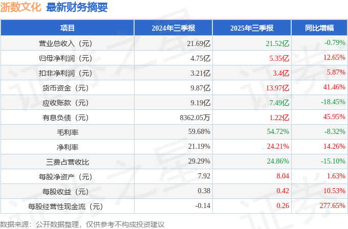 据证券之星公开数据整理,近期浙数文化(600633)发布2025年三季报。截至本报告期末,公司营业总收入21.52亿元,同比下降0.79%,归母净利润5.35亿元,同比上升12.65%。按单季度数据看,第三季度营业总收入7.38亿元,同比下降2.45%,第三季度归母净利润1.57亿元,同比下降51.93%。本报告期浙数文化公司应收账款体量较大,当期应收账款占最新年报归母净利润比达146.49%。