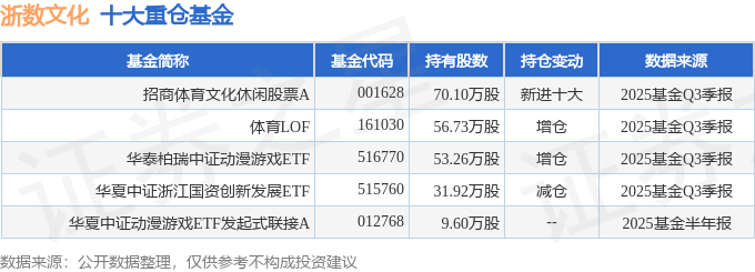 持有浙数文化最多的基金为招商体育文化休闲股票A,目前规模为2.16亿元,最新净值1.864(10月27日),较上一交易日下跌0.37%,近一年上涨24.52%。该基金现任基金经理为文仲阳。