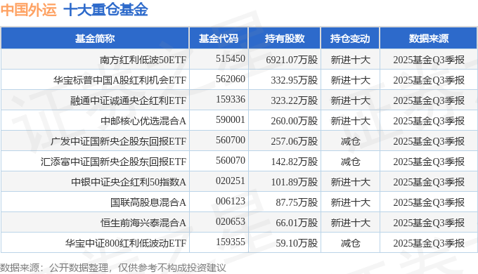 持有中国外运最多的基金为南方红利低波50ETF,目前规模为127.39亿元,最新净值1.4461(10月28日),较上一交易日下跌0.6%,近一年上涨11.2%。该基金现任基金经理为崔蕾。