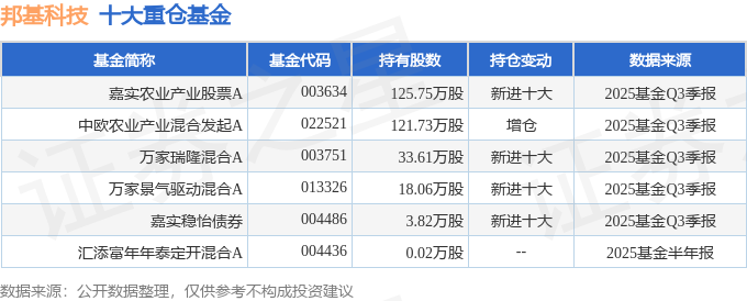 持有邦基科技最多的基金为嘉实农业产业股票A,目前规模为9.67亿元,最新净值1.4097(10月27日),较上一交易日上涨1.01%,近一年上涨4.52%。该基金现任基金经理为吴越。